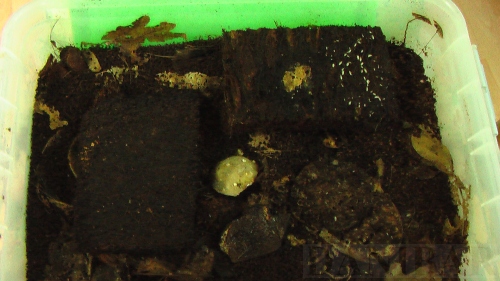 Stínky žabkám podávám buď tak, že oklepu odřezek xaximu do terária, nebo jednoduše naberu substrát i stínkami v místě nejvyššího výskytu, což bývá hlavně pod plátky brambor, a vhodím do terária.